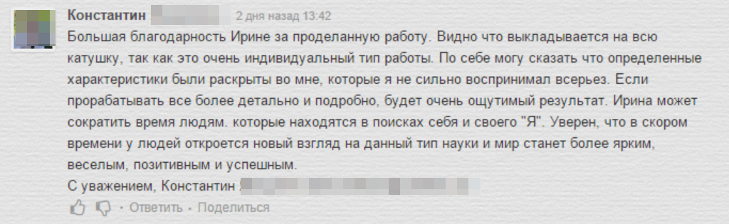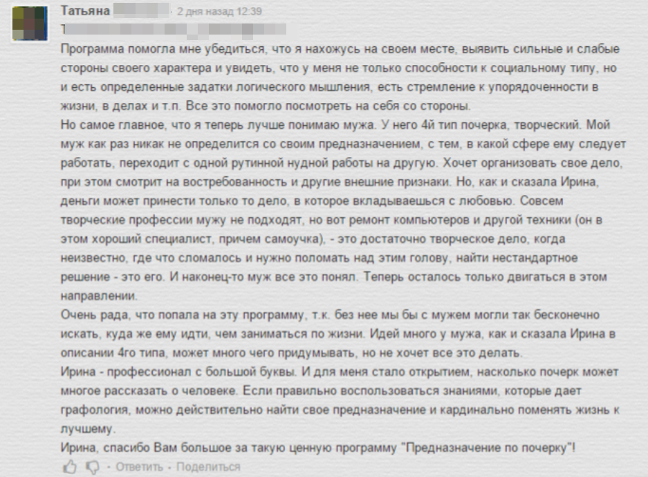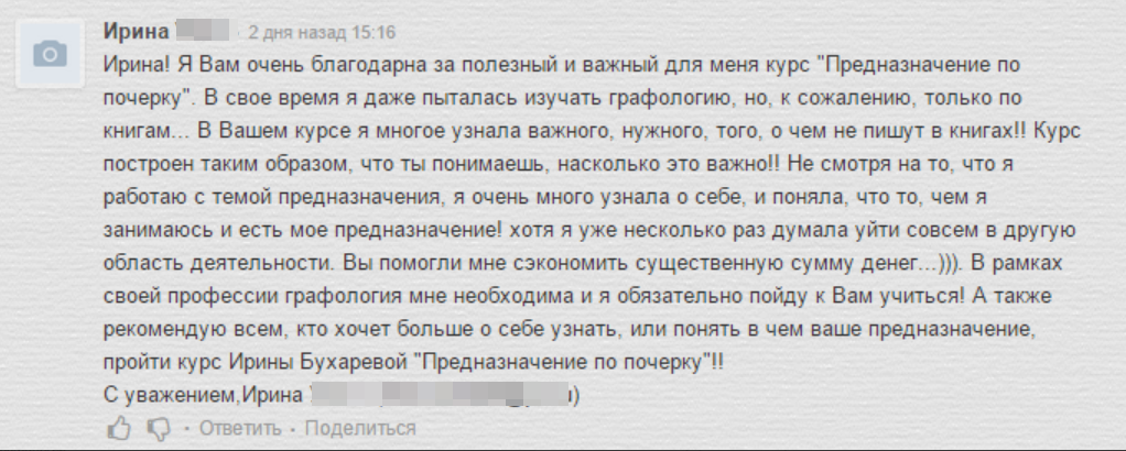 На счету Ирины десятки выступлений в СМИ, ее статьи публикуют ведущие издания. Обучает психологов, коучей и HR-специалистов психодиагностике личности на основе анализа почерка по наработанной за годы практики собственной программе.